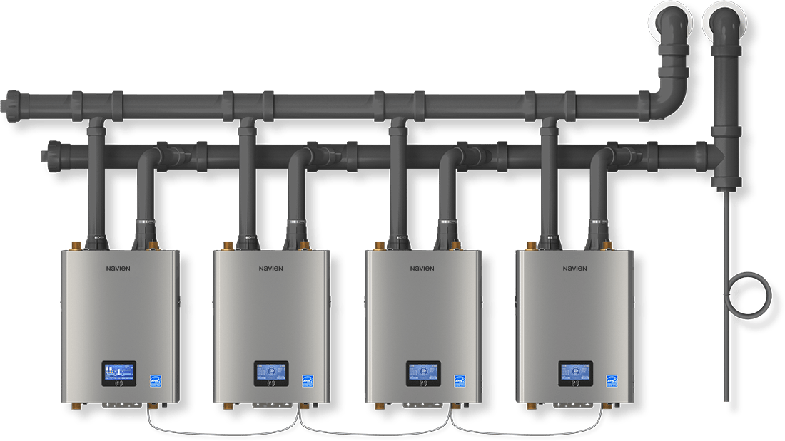 The Navien cascading system also balances out the workload of each unit for a longer service life. The NHB-H is also certified for common venting, reducing the venting and number of terminations required.